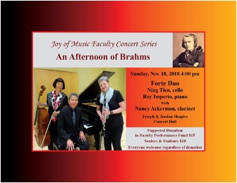 With Reginald Pineda, violin, Elizabeth Bronstein, cello, Sanghee Kim, piano - Faculty Recital, “An Afternoon of Brahms” music for cello, clarinet, and piano, November 18, 2018